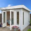 This low roof (≤ 250 high) log cabin has a very obvious ‘wow factor’. That’s because of its unfussy design and the many windows and doors. This log cabin is therefore very light and airy. On a sunny day, throw open the large double doors to let the sun in. This log cabin is ideal as a home office, study or other hobby space. Insulation is always an option.