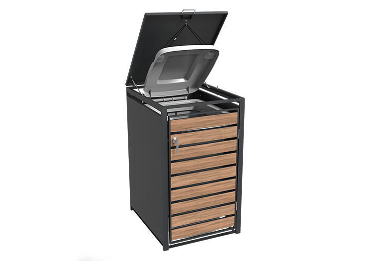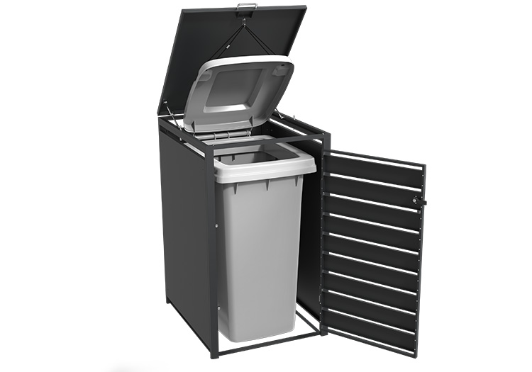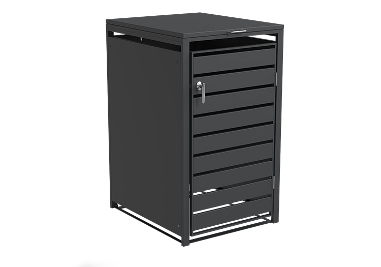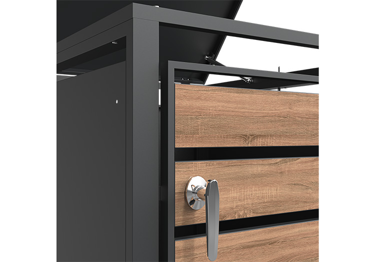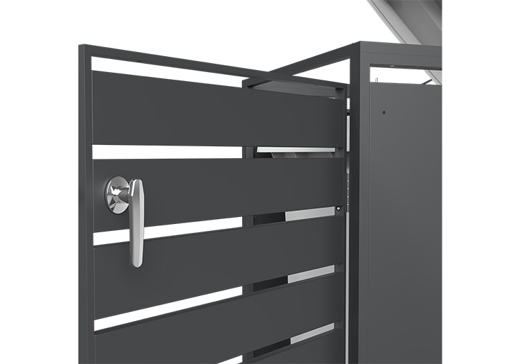 Conceal your bins with our discreet Composite bin store. The lid boasts gas springs and pressure dampers, along with a hook and chain mechanism for easy lifting and hassle-free waste disposal. Additional highlights include a soft-close lid, magnetic doors for stability in any weather, pre-drilled holes and fixings for secure ground attachment, and a concealed lock within the stainless steel handle. Compatible with 60L, 120L, and 240L wheelie bins. Offered in two colour options, two designs, and the ability to connect units together to suit individual household needs.