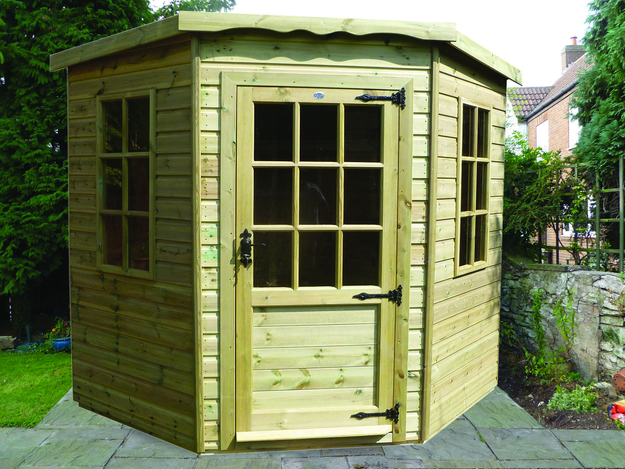 The corner building is ideal for the smaller garden and can be easily located into a corner of your garden and still provide excellent space. Comes with flat roof felted as standard and a single door. Two windows are also fitted and the building is pressure treated as standard