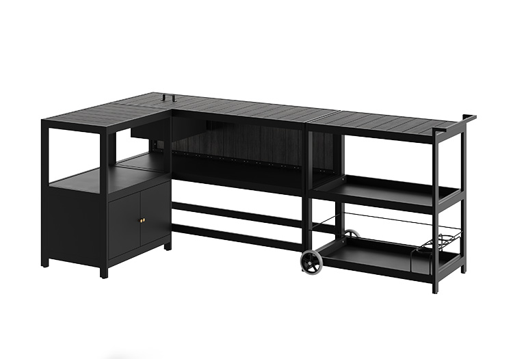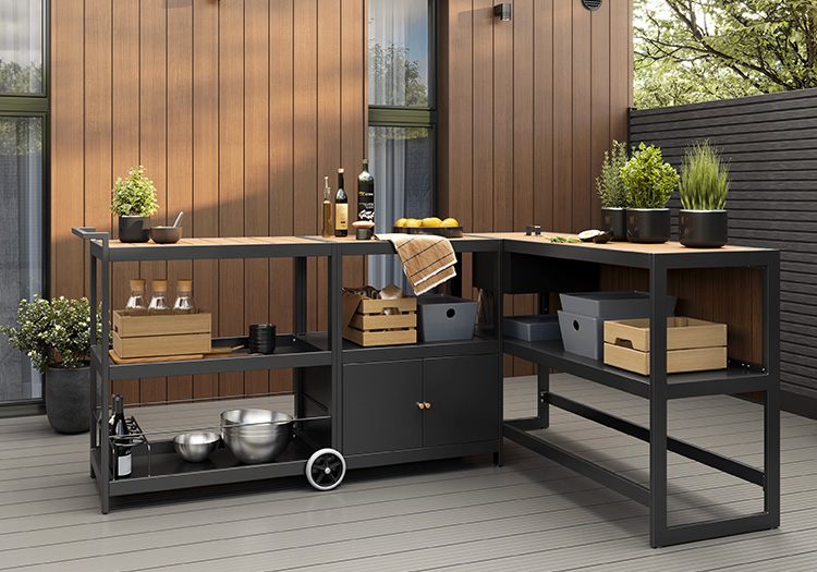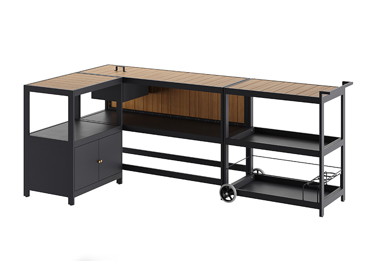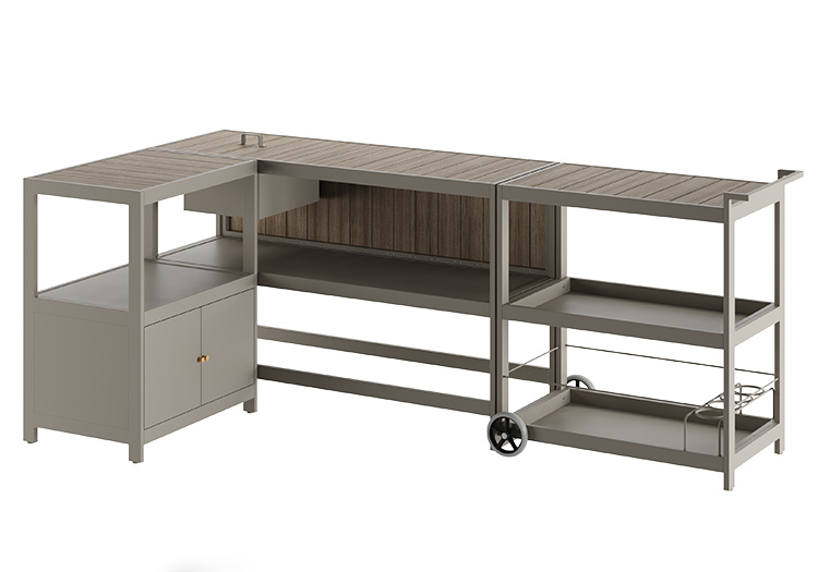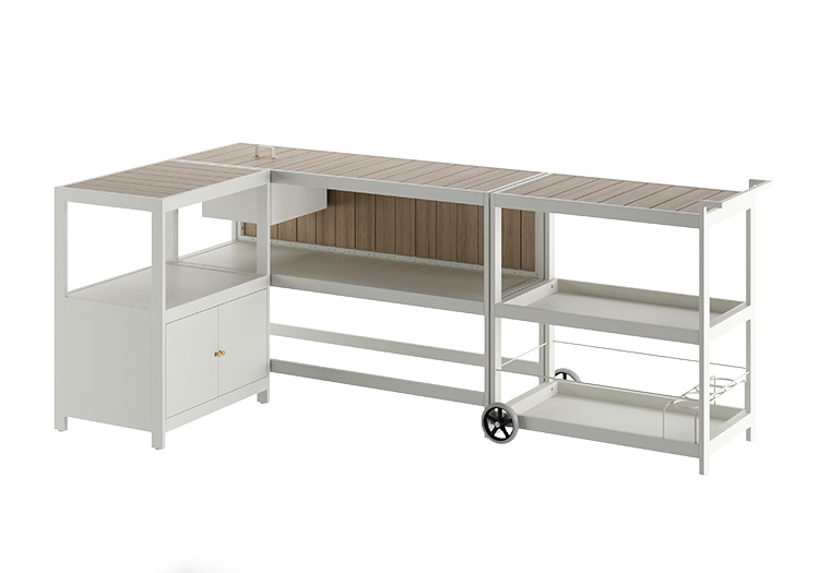 Our new outdoor kitchen is made from powder coated aluminium and 100% recycled polywood. This versatile set of 3 units feature a Trolley, Cabinet and Worktop. The trolley unit comes with bottle holders, wheels and handle for ease of movement around your outdoor space for entertaining.