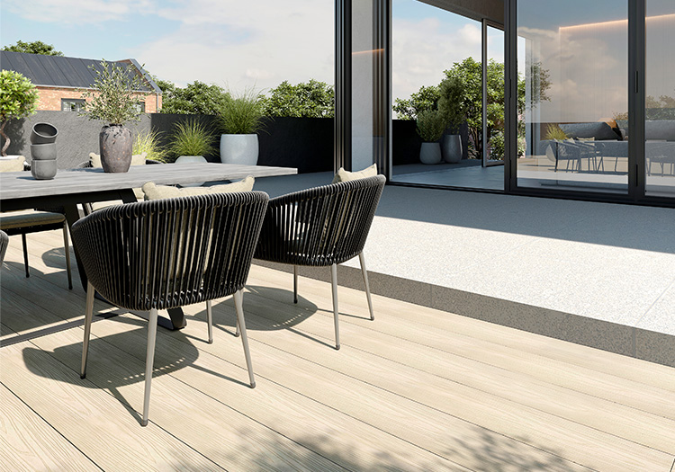 Ecoscape UK Grande decking has a dual surface finish with wood grain on each side: the front of the board is coloured in a toned ‘Chateau’, and the rear is coloured in the light-grey ‘Dovetail’ – a perfect alternative or accompaniment to stone or ceramic paving. At 9 inches wide (225mm), it really does provide a premium, contemporary finish.