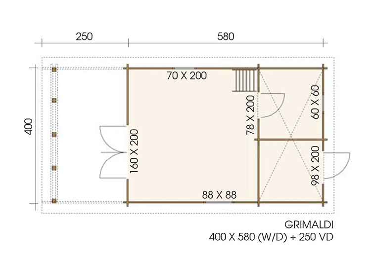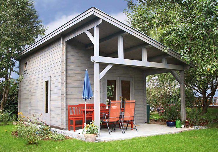 The Grimaldi is a 45mm wall log cabins with double doors and side window. Two more seperate areas inside with a roof area. Entrance to rear of one area. Comes complete with high quality roof shingles.