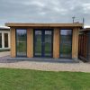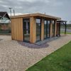 Introducing the Helmsley Garden Room range – a stunning cedar-clad building with exceptional standard features. This garden room is equipped with PVC French doors and front PVC windows, along with a roof featuring a 20-year guaranteed EPDM covering. The inclusion of spotlights provides ample light both inside the building and under the outside canopy during darker evenings. To enhance the interior, a Click flooring system and plasterboard finish with skirting and architrave are installed.