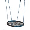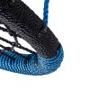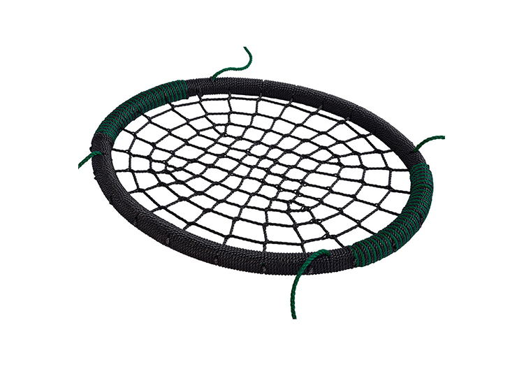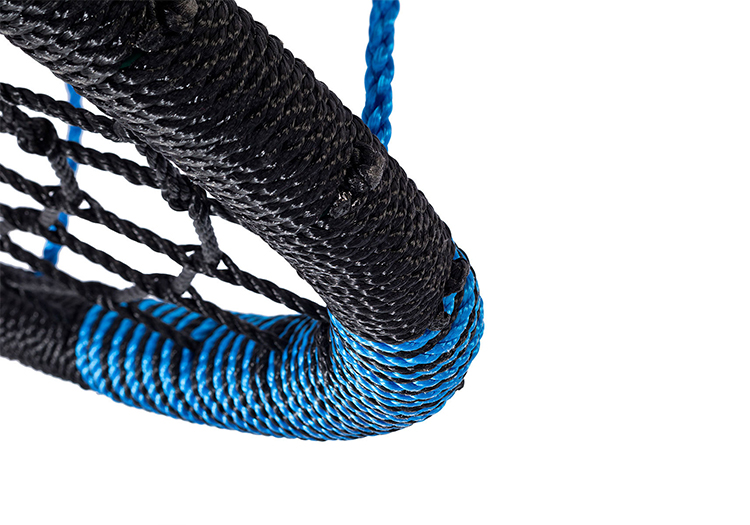 The unique nest swing has webbing and suspension ropes in PP rope which is designed as a look-a-like of a commercial nest swing. To create soft impact zones PP rope is wound around the steel frame and soft padding was applied at both longitudinal ends. This high quality product is fitted with rings and eights in galvanised steel and ropes with black PP welds.